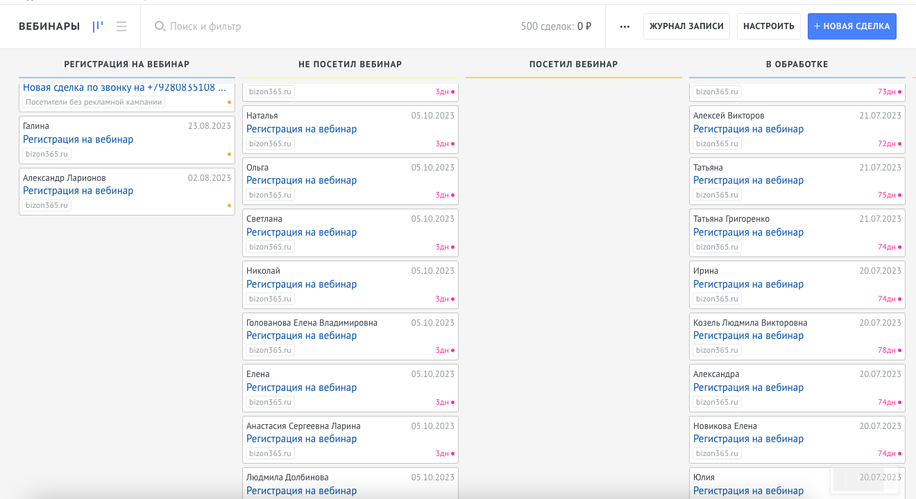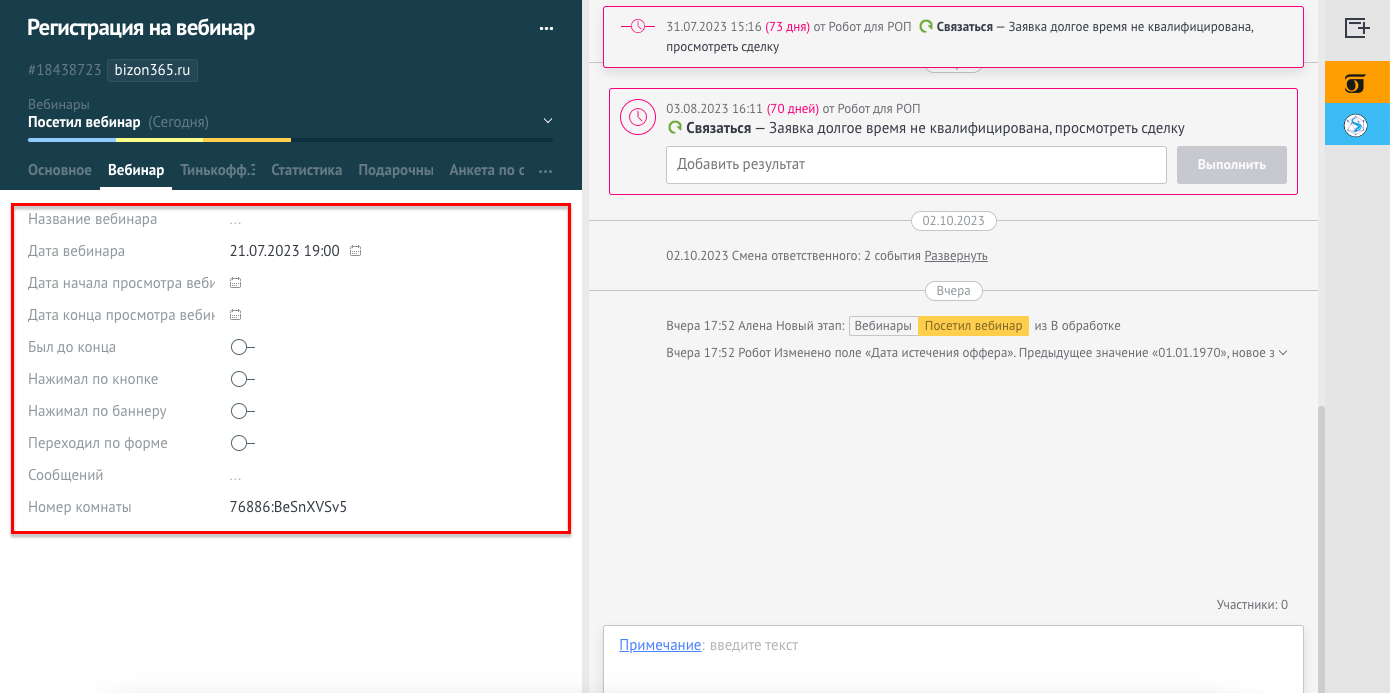 Данные о вебинаре и клиенте систематизированы в одном месте