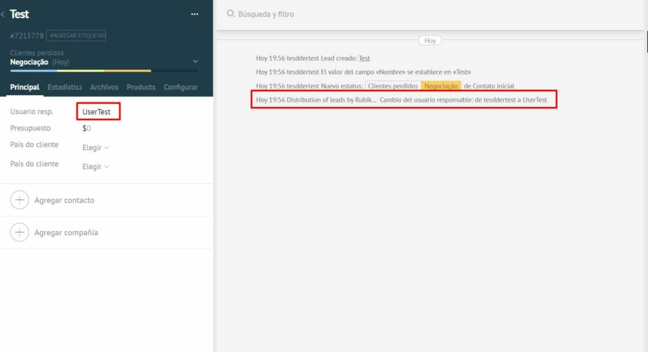 Cuando aparece un nuevo lead, se distribuye automáticamente entre los usuarios predefinidos en la configuración