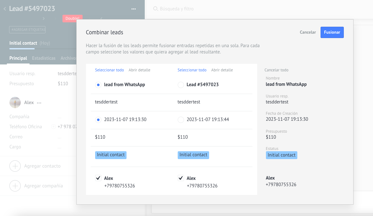 Fusionar leads utilizando la ventana estándar de amoCRM
