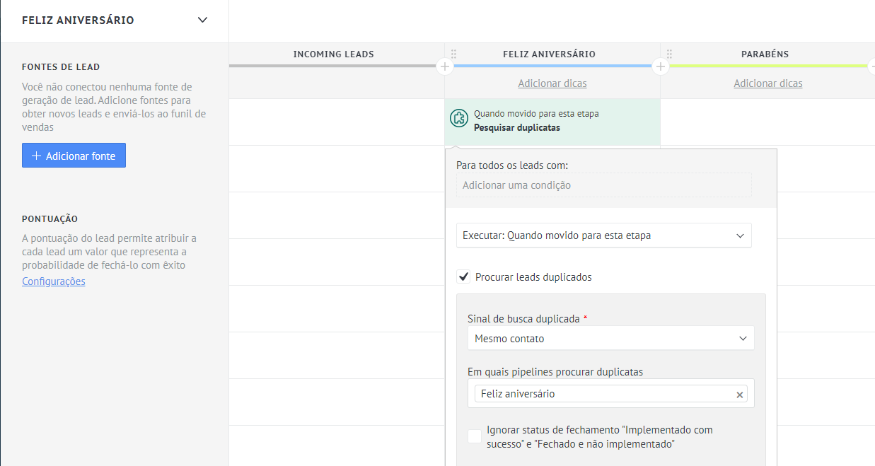 Usando o gatilho do widget "Pesquisar duplicatas", podemos configurar uma combinação de leads em seu pipeline de correspondência para que o cliente não receba spam caso você tenha vários leads por cliente em seus funis principais