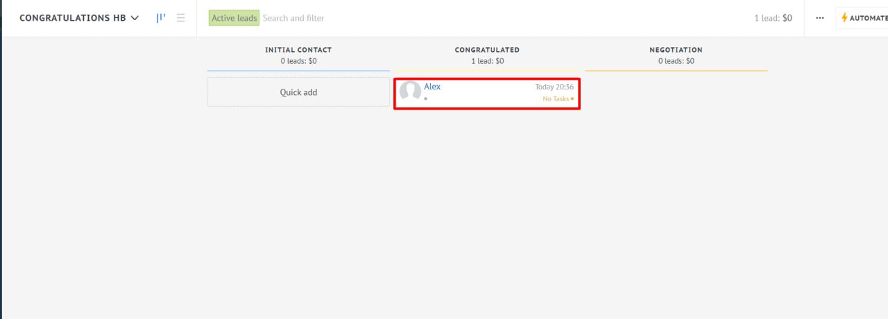 Como resultado, você receberá automação relacionada à criação de um lead do pipeline principal para um pipeline de mala direta adicional. Nesse pipeline, seus clientes receberão a mensagem necessária cronometrada na data que você precisa.