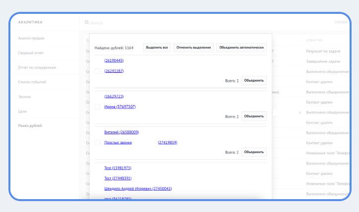 В виджете есть все, что Вам может понадобиться при исправлении дублей: ручной поиск и массовое объединение, предупреждение о дублей, автоматический поиск дублей по триггеру в автоворонке